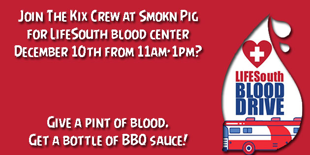 Join The Kix Crew LIVE at the Smokn Pig BBQ and help out our community with LifeSouth blood center December 10th from 11am-1pm? They are going to give a free bottle of Bbq sauce for everyone who donates blood that day! 1 Pint of blood = 1 bottle of BBQ sauce = Lives Saved! It’s […]