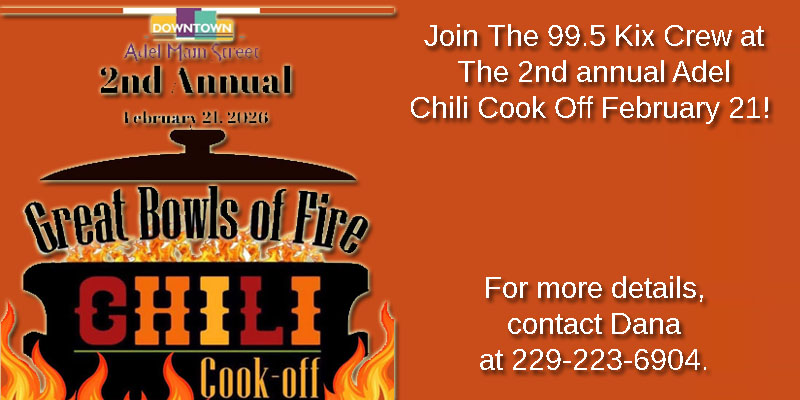 Join The 99.5 Kix Crew for “The Great Bowls of Fire Chili Cook Off” in downtown Adel on Saturday, February 21 from 10-noon. This annual event is a prime opportunity for local chili enthusiasts and vendors to showcase their culinary skills. Event Details Time: 10:00 AM – 2:00 PM EST. Location: 125 S. Hutchinson Ave, Adel, GA (Downtown […]